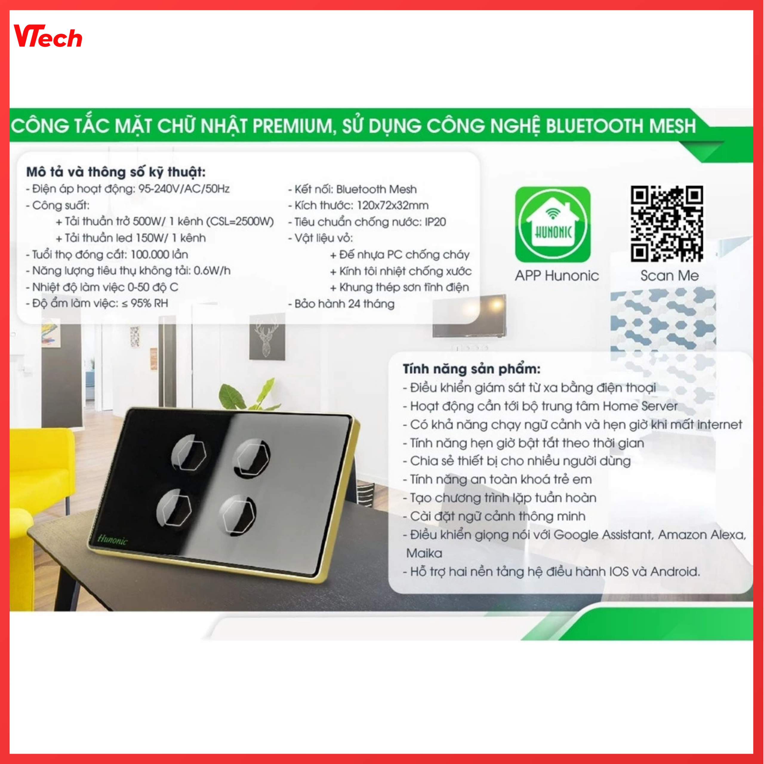 🔧 Thông số kỹ thuật Công tắc Hunonic Premium 4 Nút